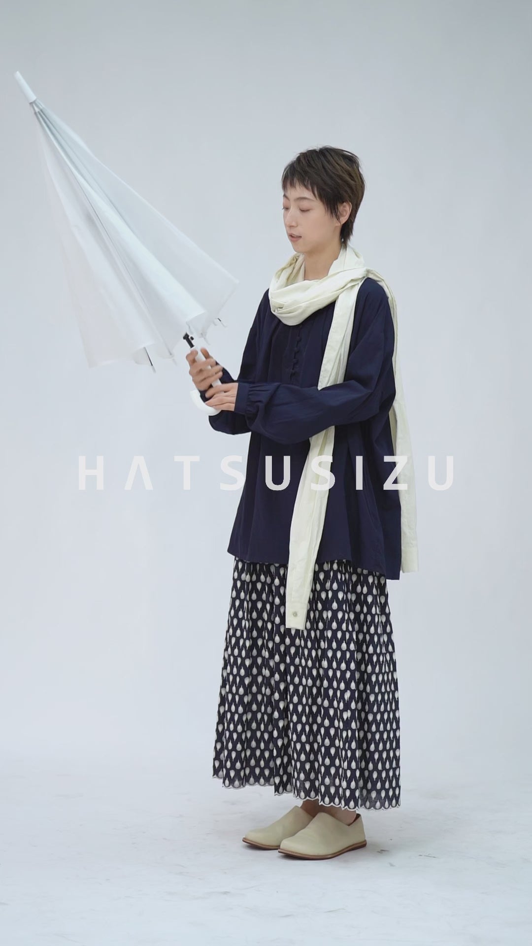 程よくハリのある風合いのコットン素材を使用し、美しいシルエットをキープ。幅広のウエストデザインが腰まわりをすっきりと見せ、切り替え仕様で自然にカバーします。全体に施された小さなドロップモチーフが軽やかで、どこかアートな雰囲気を演出。軽やかに跳ねる音符のような柄が、フレンチライクなリラックス感を添えます。