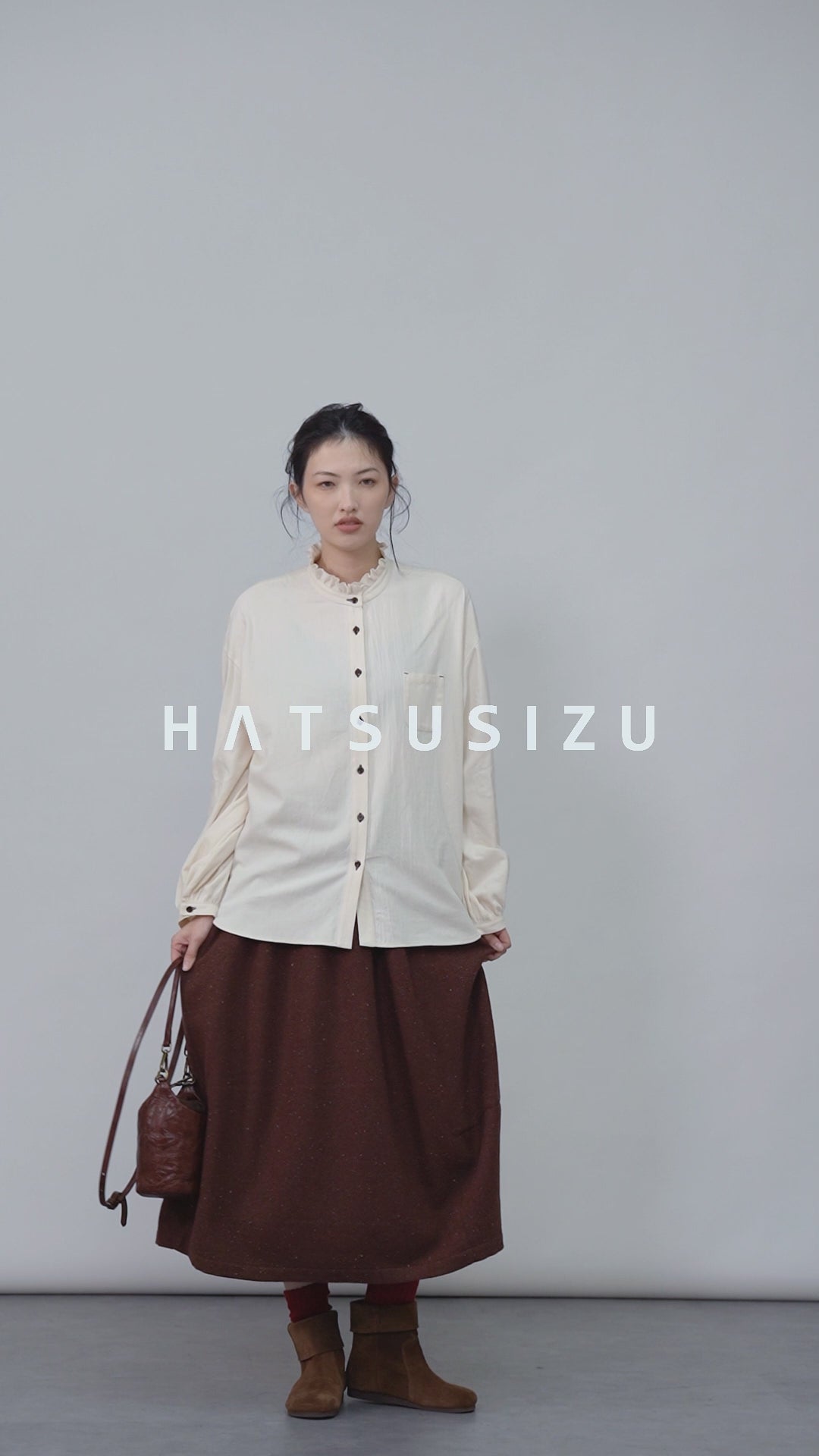 フリルをあしらったスタンドカラーが、控えめな文芸的ムードを演出。