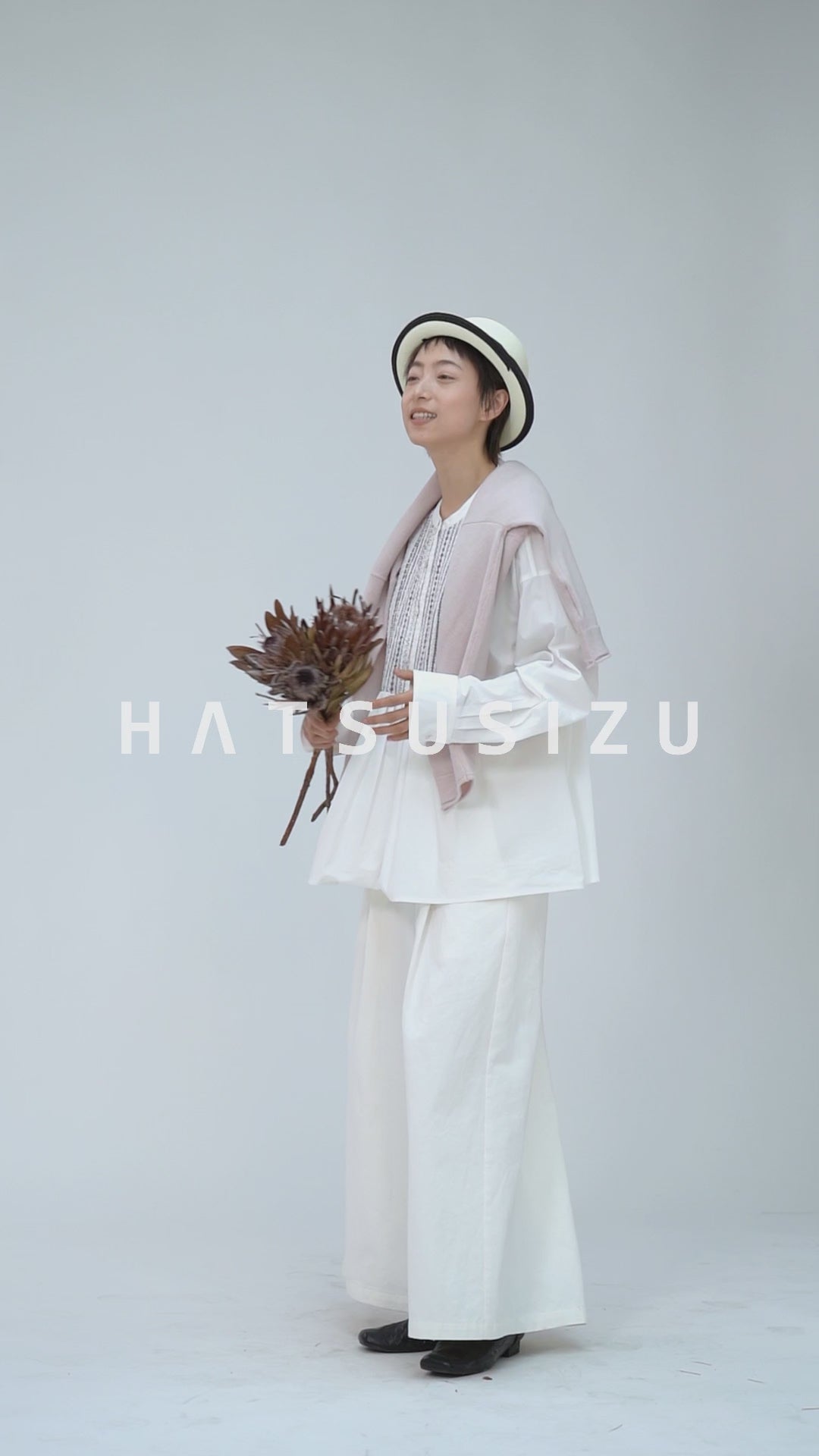 “紙”のようなハリ感を持つコットン地を使用。軽やかなのに型崩れしにくく、身体からふわりと離れるシルエットでナチュラルな抜け感を演出します。凛としたスタンドカラーに、胸元のスモッキング刺しゅうをあしらい、細かなステッチと上品な柄行きが表情豊かに。やや短めの着丈が脚の比率を高く見せ、どんなボトムともバランス良く決まります。