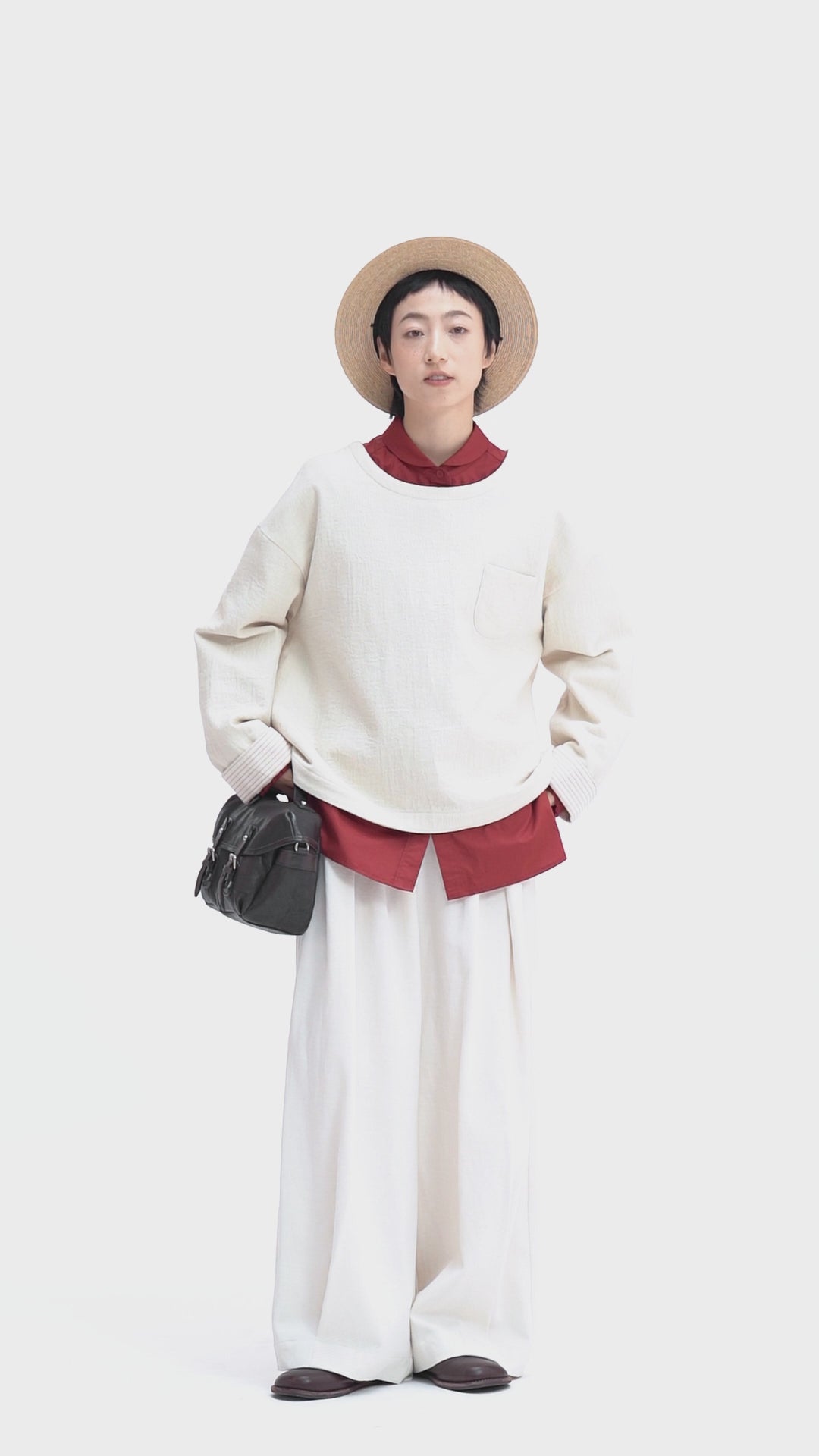 デザイン: ミニマルなプルオーバータイプに、水面の微波のような豊かな表情をプラス。 ネックラインと袖口に施された精緻なステッチがアクセントとなり、手仕事のような温もりと工芸的な美しさを感じさせます。 シンプルながらも素材の個性が際立つ、大人のリラックスウェアです。